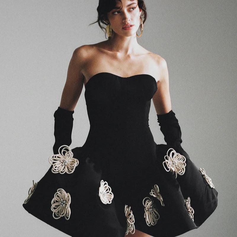 Popular women's clothing French Hepburn style tube top tutu skirt black flower bandage dress