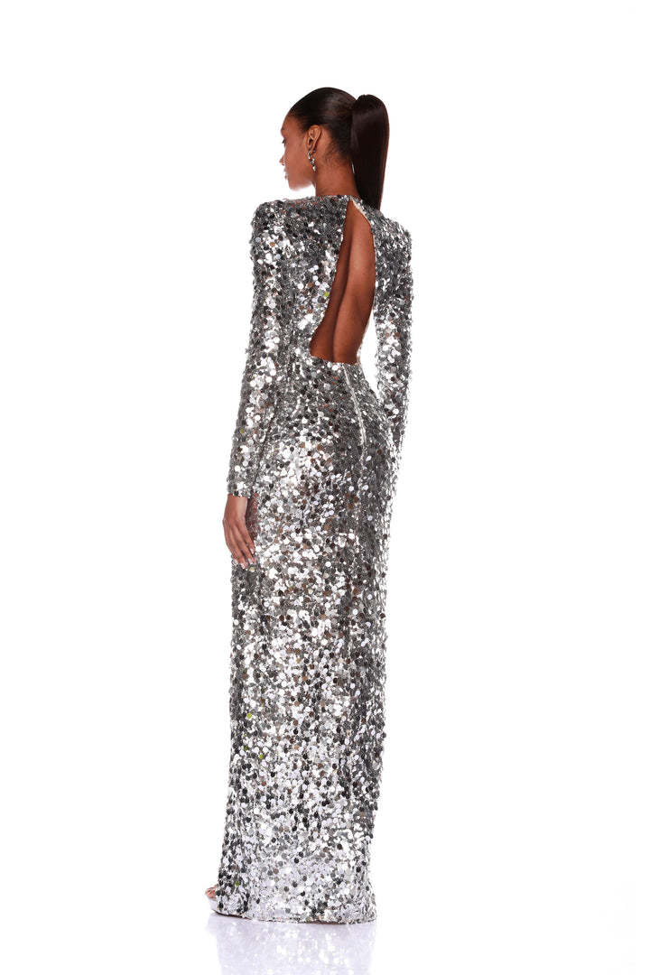 New European and American women's sexy backless dress with long sleeves, sequins and slits, fashionable and slim-fitting evening gown