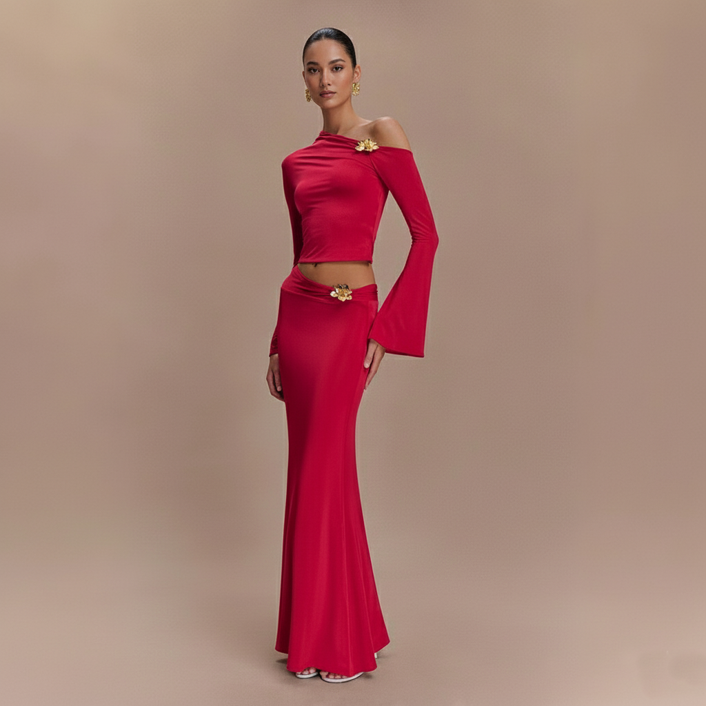 Spring and summer fashion personality temperament elegant oblique collar three-dimensional decoration high waist slim long skirt suit women