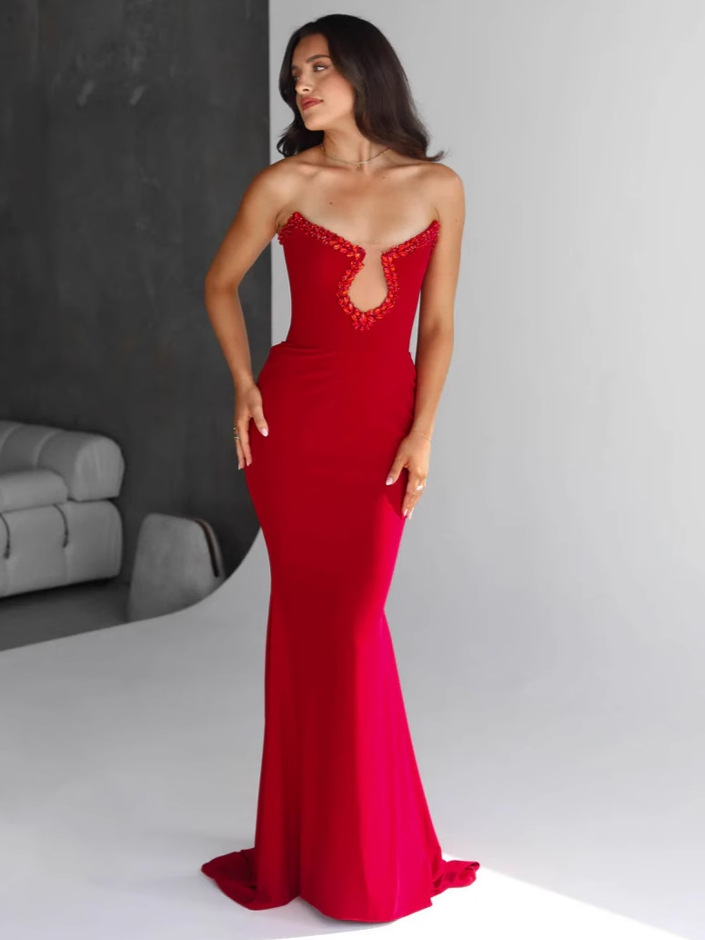 Spring and summer European and American red diamond-studded tube top evening dress for women's banquets