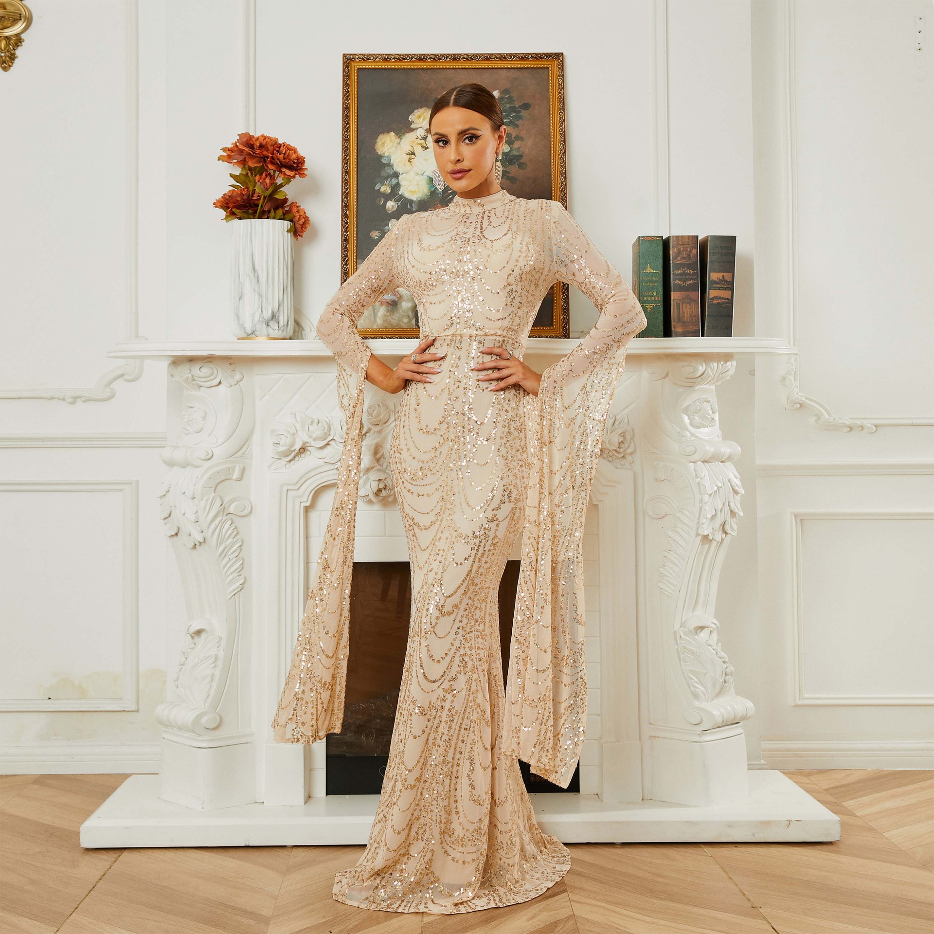 high-end temperament sexy long sequined long-sleeved high-neck banquet evening dress bridesmaid dress dress for women