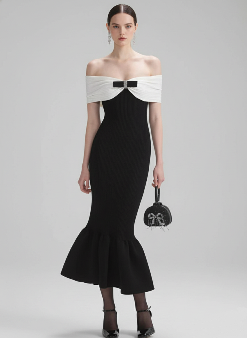 New European and American women's elegant bow strapless waist dress temperament slim hip fishtail long skirt female